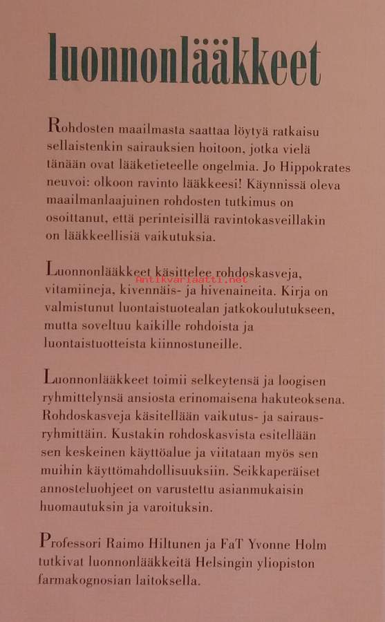 Teos kokoaa yhteen keskeiset lääkekasvit ja niiden vaikuttavat aineet, haittavaikutukset ja käyttörajoitukset, kasvien tunnistuksen, keruun ja käsittelyn perusperiaatteet. Kuvitettu. Dimensiot 25 ¤ 17 cm.