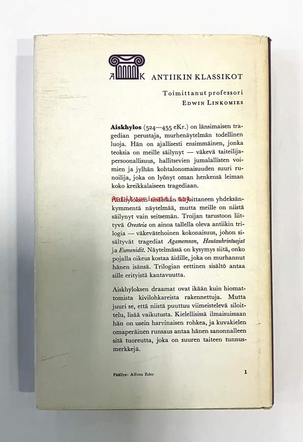 Tunnetun antiikin Kreikan runoilijan Aiskhyloksen (524-455 eKr.) teokset Agamemnon, Hautauhrintuojat ja Eumenidit.