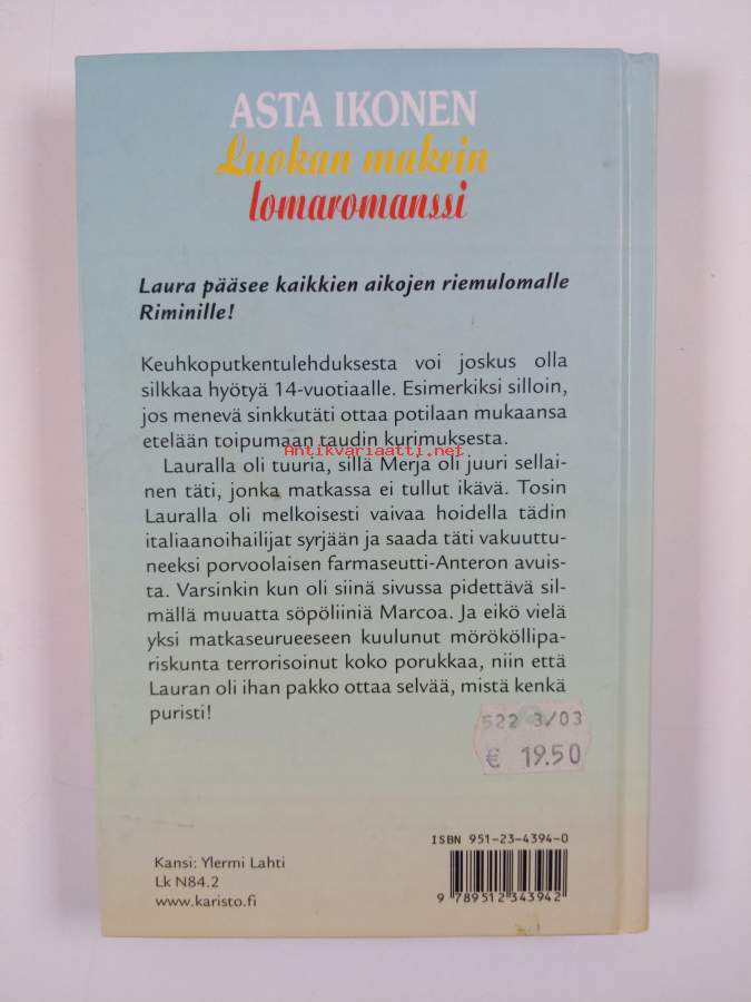 Hyvä. Tarkempi kuntoluokka: K3+ ; Hieman tahraisuutta, takana vanha hintalappu