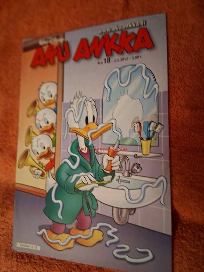 Aku Ankka N:o 17, 2012. Samassa sopassa Roope-setä, Aku Ankka ja Karhukoplakin. Aku Ankka ryhtyy ehostusmestariksi ym. Sivuja 36.