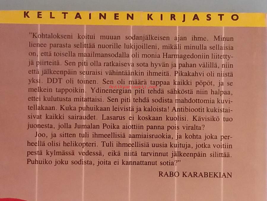 Romaani kertoo fiktiivisen taidemaalarin Rabo Karabekianin elämäntarinan. Teos käsittelee taiteen merkitystä, sodan vaikutuksia ja identiteetin rakentumista Vonnegutin omintakeisella, ironisella tyylillä. Dimensiot 20 ¤ 13 cm.