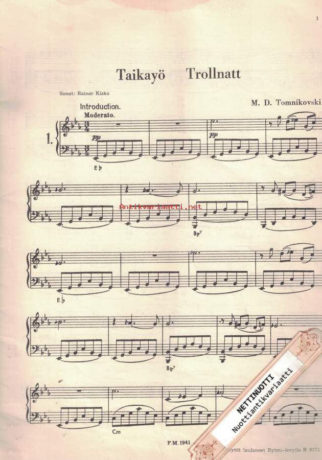 Pianolle: 1. Taikayö 2. Kaipaus (Tosca) 3. Mustat silmät 4. Amurin aallot 5. Katkenneet kielet 6. Odotus 7. Mustunut elämä 8. Elämä juoksuhaudoissa