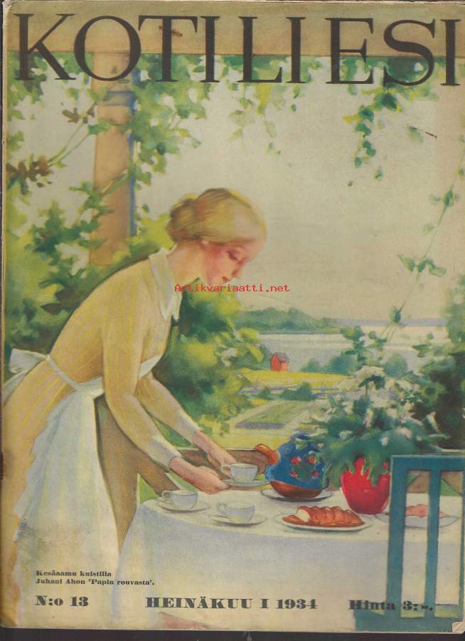Kotiliesi 1934 nr 13 kansi. Heinäkuu 1934. Kansikuvitus Rudolf Koivu- Kesäaamu kuistilla - Juhani Ahon kirja Papin rouva, Kotilieden vaarat, Vuodevaatepuhdistus
