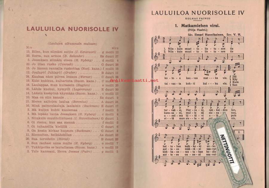 Sis: Matkamiehen virsi, op18, nro 1 / Hannikainen, IlmariRukous (Tule kanssani Herra Jeesus) / Putro, MoosesMä kuljen kohti kuolemaa / anon.Oi riemu / anon.Jos tuhansilla kielillä / anon.Taivaan kellot / anon.Läksin minä kesäyönä käymään / trad.Iltalaulu (Jo lännen rannalla ruskottaa) / anon.Tukkipoika se lautallansa / trad.Mä lepään luona Jeesuksen / Nyberg, HuugoFör Jesu milda ögon / Nyberg, HuugoSun rauhasi anna mulle / Nyberg, HuugoSunnuntaiaamuna / Backman, HjalmarDejlig er jorden / trad.Stille Nacht, heilige Nacht / Gruber, FranzKuu / Keravuori, InkeriHanhipaimen / Backman, HjalmarLaula kultani / Hagfors, Erik AugustKäköä kuulessa / trad.Nylänningarnas marsch / BoreniusHerra, sun armos / Relander, Bertha- Pieni Helposti kuori