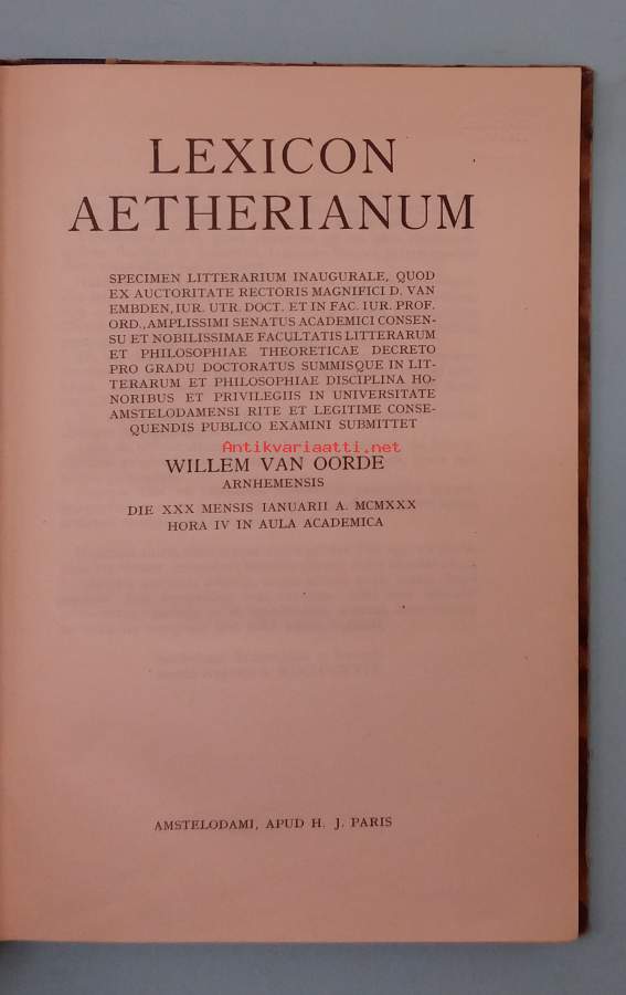 Lexicon Aetherianum on tieteellinen erikoissanasto, joka on laadittu selittämään ja analysoimaan Peregrinatio Aetheriae ‑teoksen (tunnetaan myös nimellä Itinerarium Egeriae) latinaa, sanastoa ja kielellisiä erityispiirteitä. Leima: Bibliotheca. Univer. Hels.” = Helsingin yliopiston kirjaston vanha leima. Ei muita merkintöjä. Dimensiot 22 ¤ 15 cm.