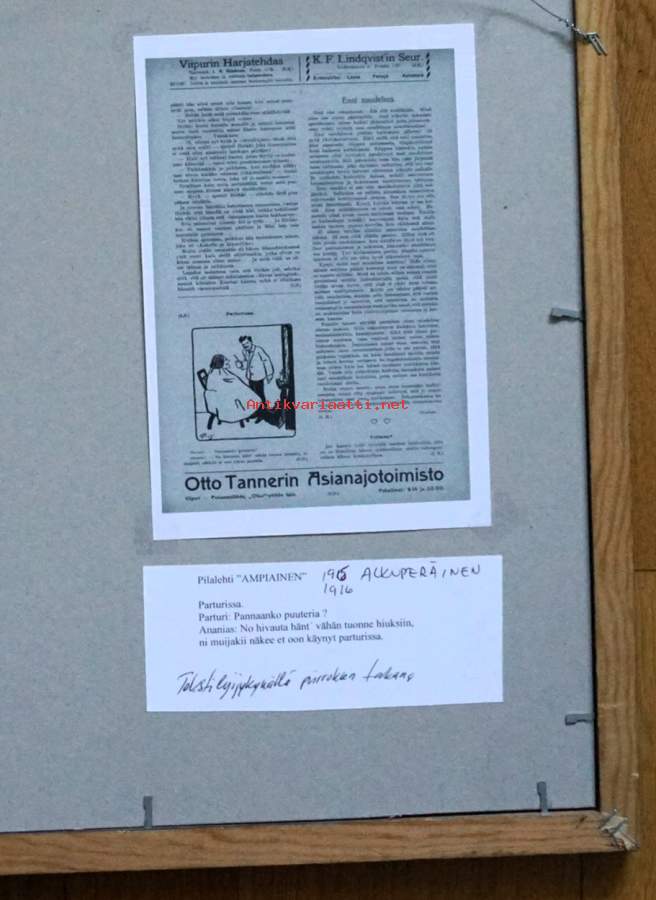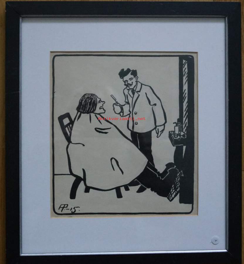 Alexander Paischeff, "Parturissa " tussipiirros sign AP-15 ,43x38 cm kehystetty Pilalehti Ampiaisen alkuperäispiirros