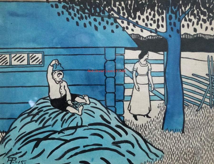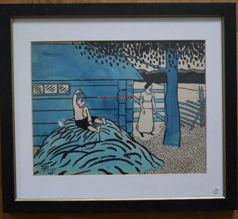 Alexander Paischeff, "Kaupunkilaispoika " väritetty tussipiirros sign AP-15, 43x38 cm kehystetty Ampiaisen alkuperäispiirros