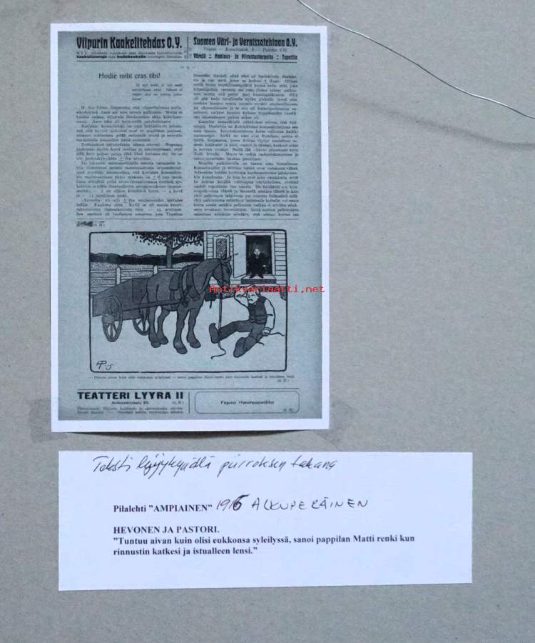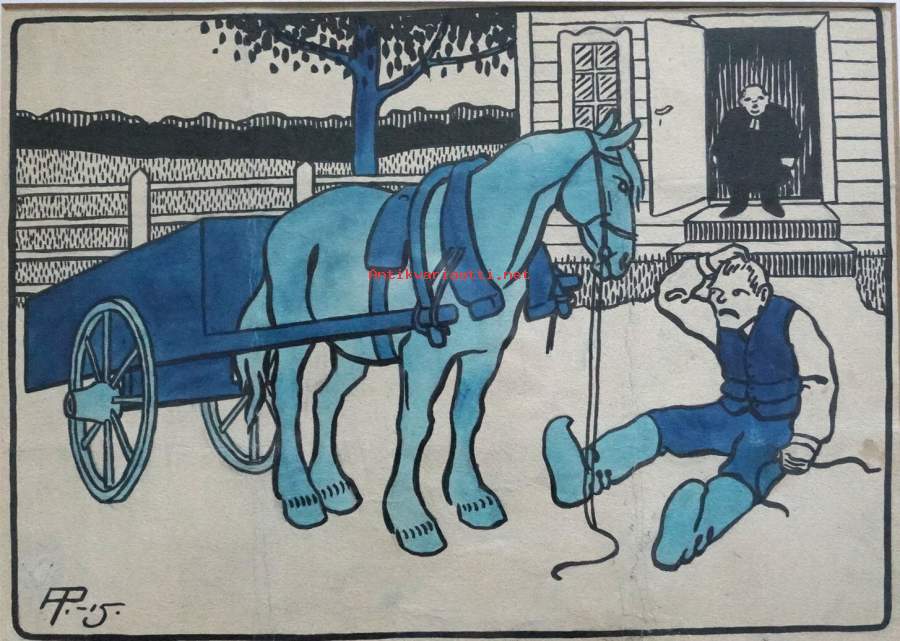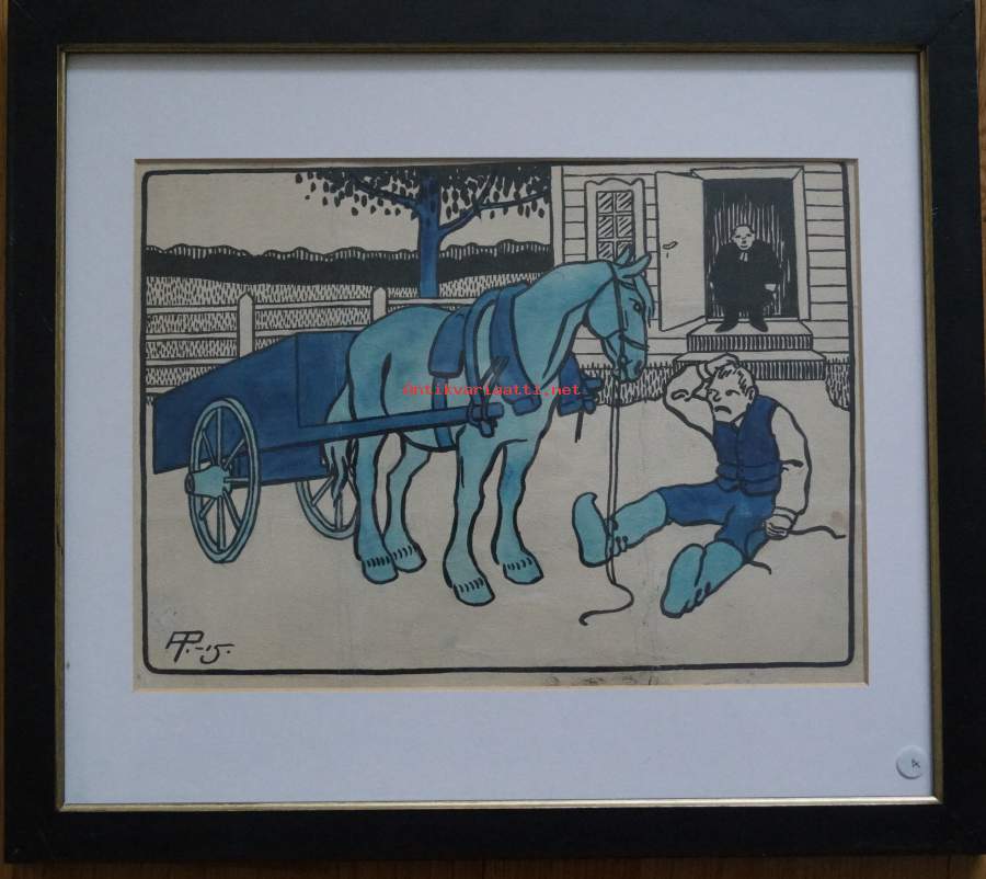 Alexander Paischeff, "Hevonen ja pastori " väritetty tussipiirros sign AP-15, 43x38 cm kehystetty Ampiaisen alkuperäispiirros