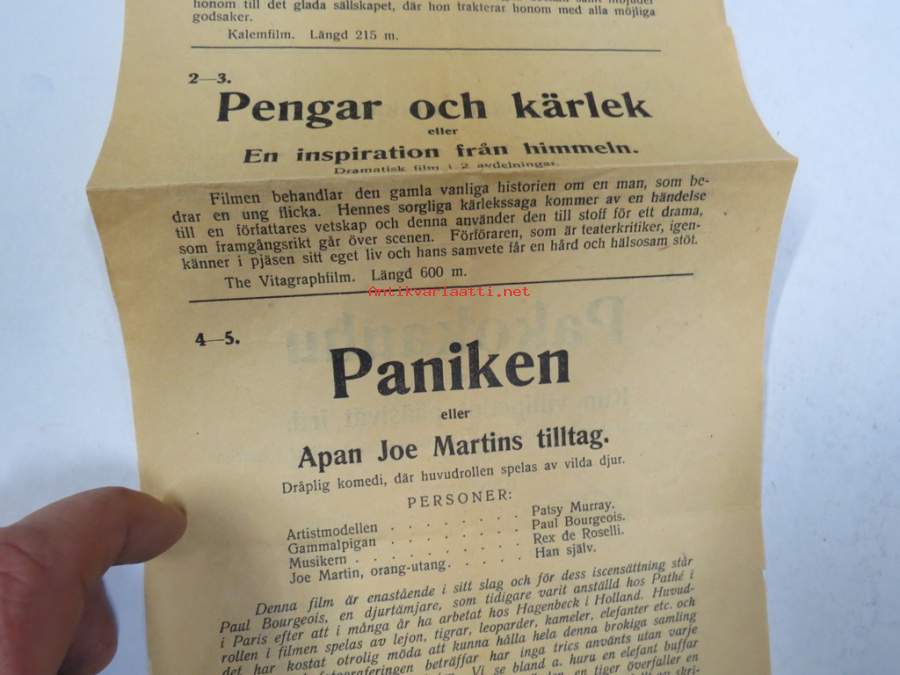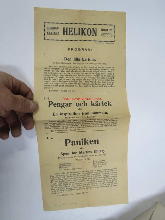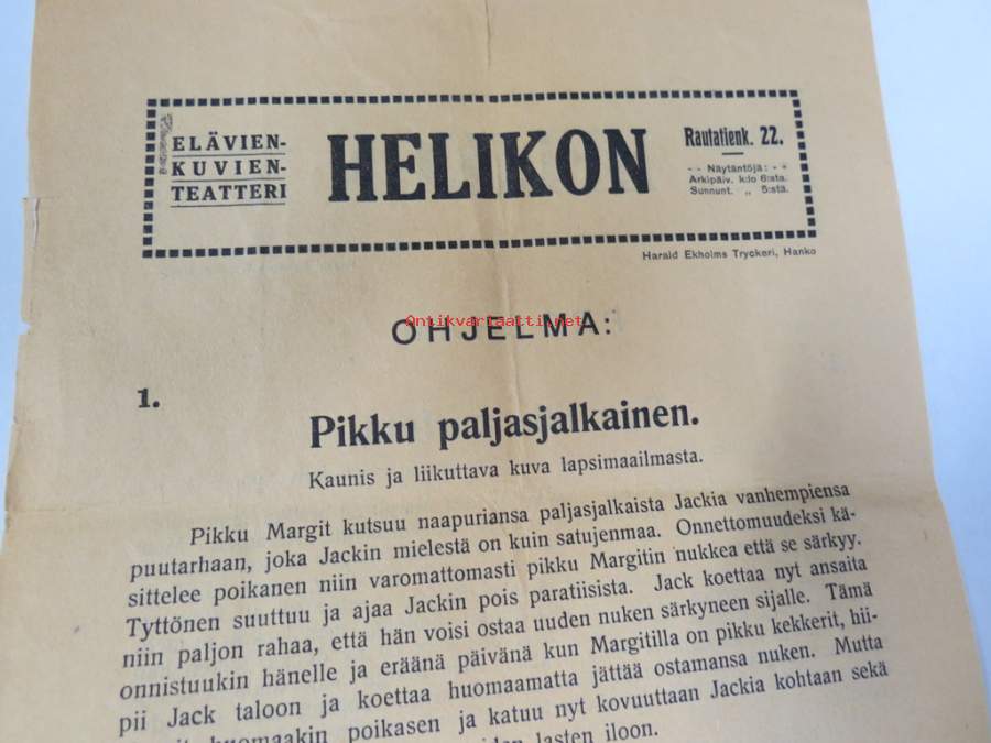 Elävienkuvienteatteri Helikon, Hanko -mainos / käsiohjelma, esitys ollut 19.11.1916; Pikku paljasjalkainen 215 metriä Kalemfilmi / Raha ja rakkaus 600 metriä...