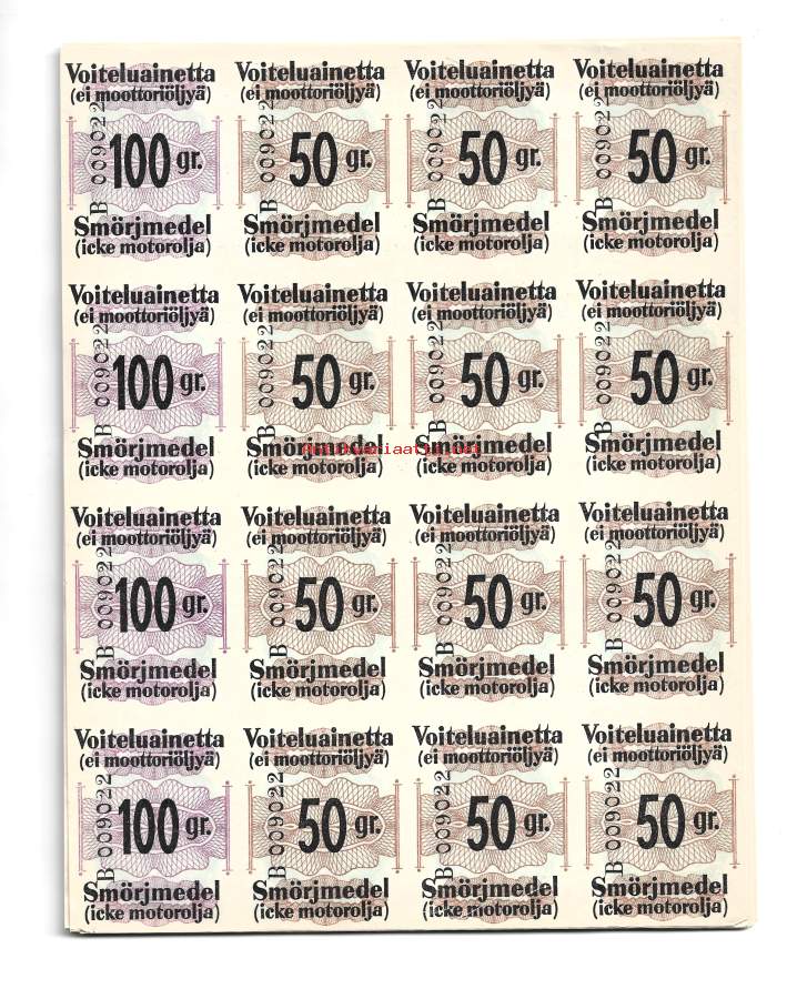 Voiteluainetta (ei moottoriöljyä) 100 gr / 50 gr Smörjmedel (ej motorolja) -säännöstelykuponki / arkki, Toukotyöt / Vårbruket 1945-sota- ja pula-ajalta