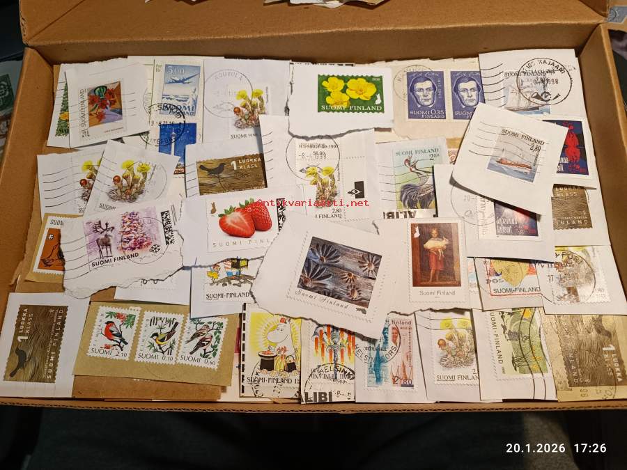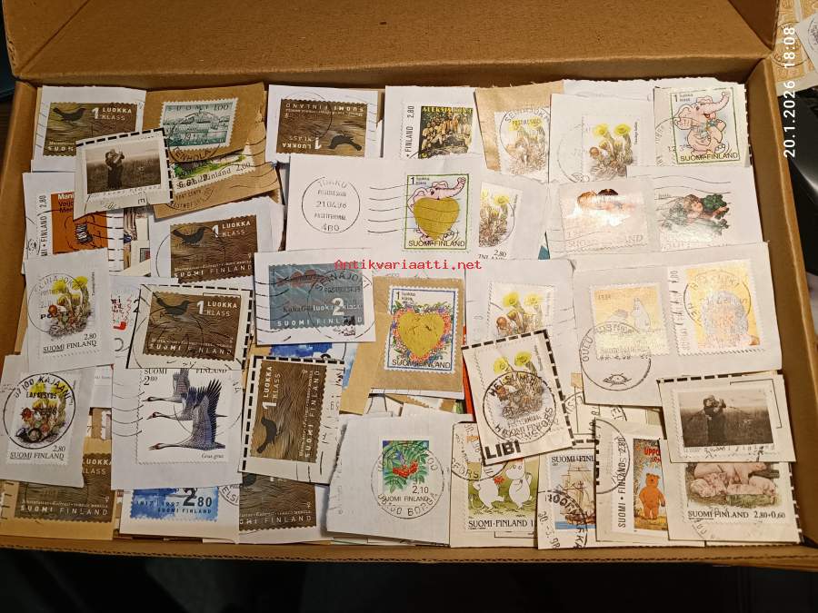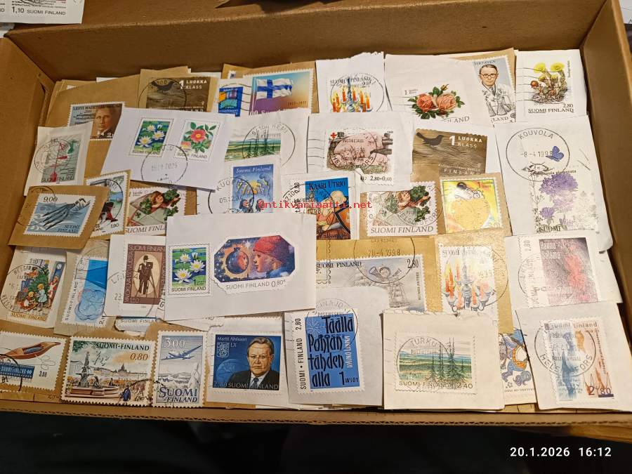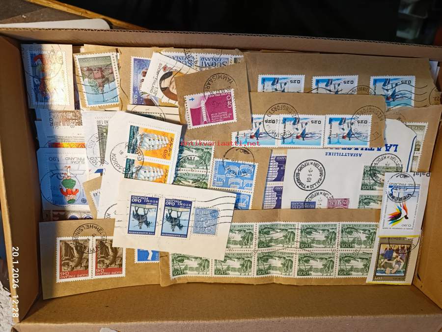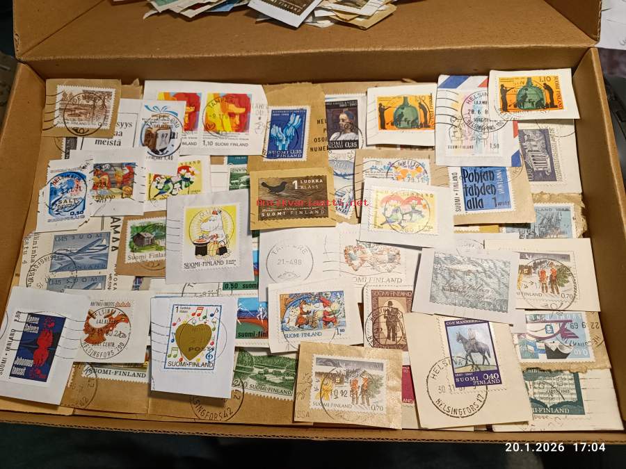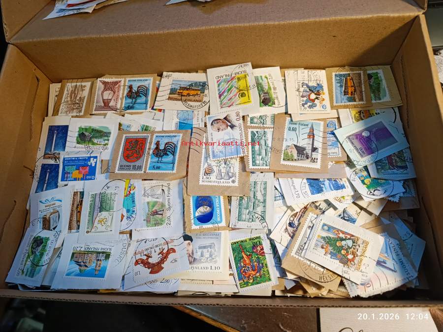 Filatelia - Suomi - Postimerkileikettä yli 1,1 kg. Pääosin 1970- ja 1980-luvuilta. Joukossa myös uudempaa leikettä.