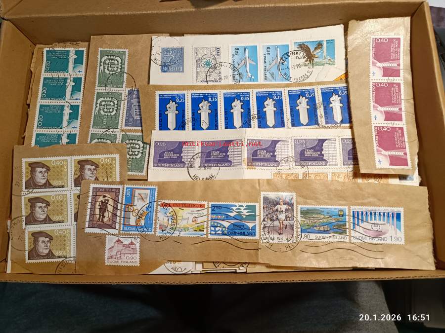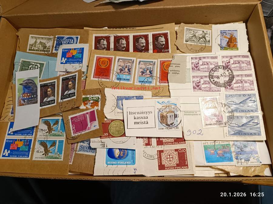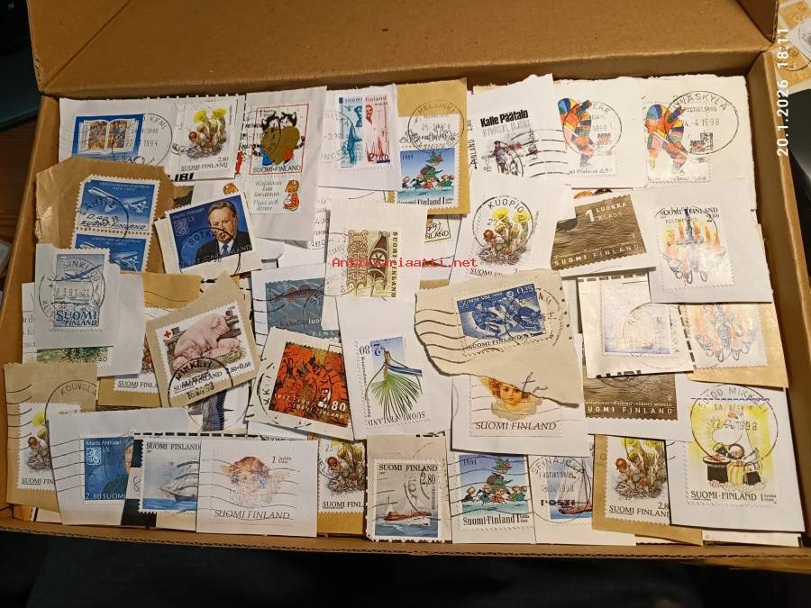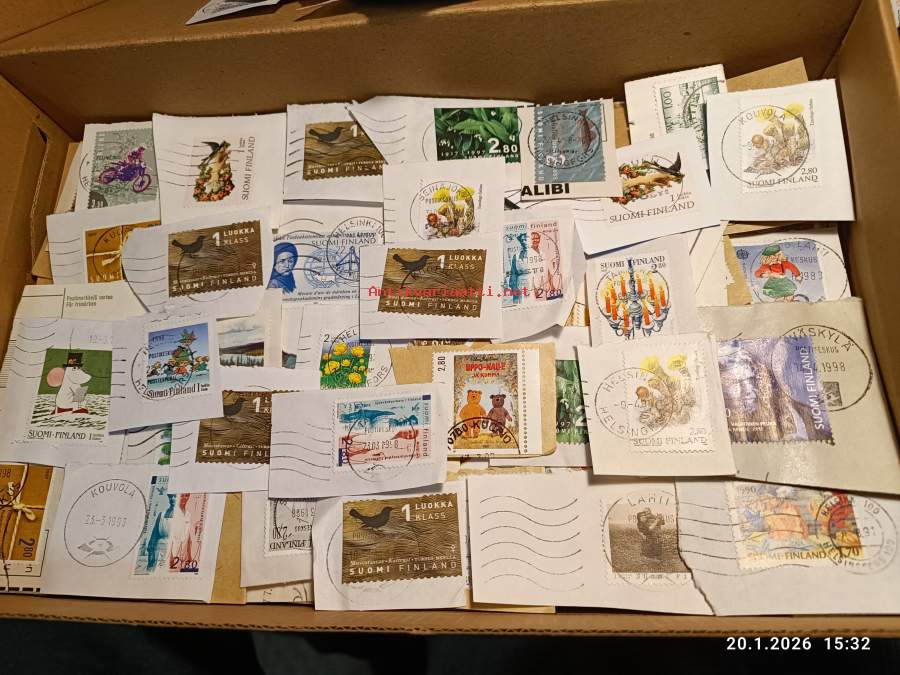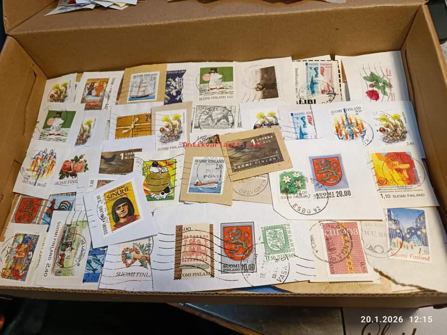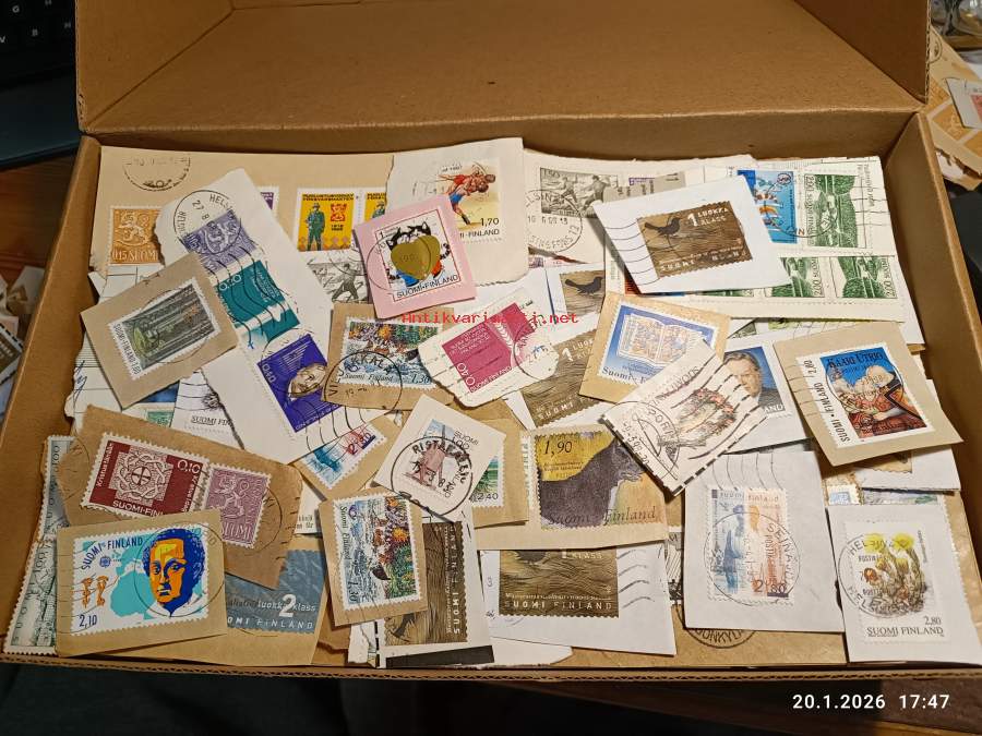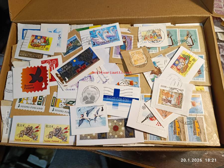 Filatelia - Suomi - Postimerkileikettä yli 1,1 kg. Pääosin 1970- ja 1980-luvuilta. Joukossa myös uudempaa leikettä.