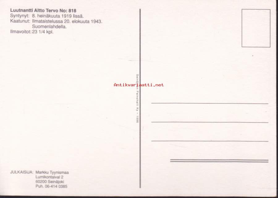 Postikortti - Hävittäjä-ässä luutnantti Altto Tervo. Ilmavoitot 23 kpl (sota, sotahistoria, ilmasota). 1996. Kulkematon.