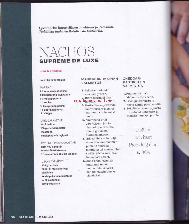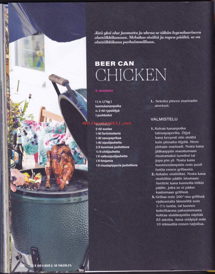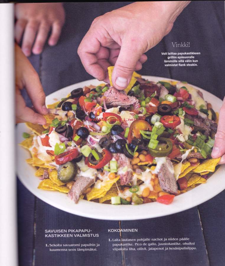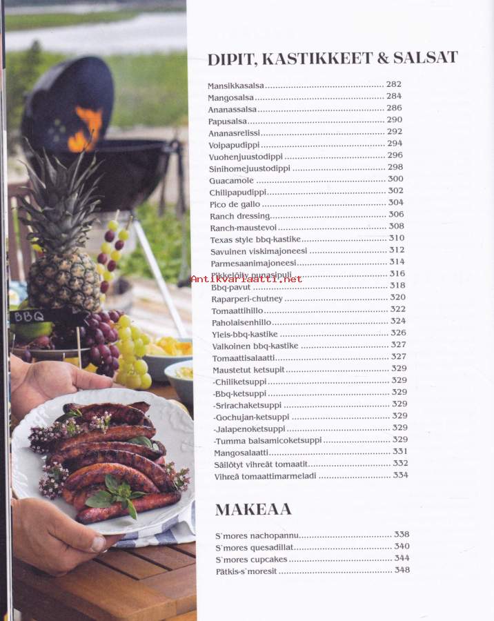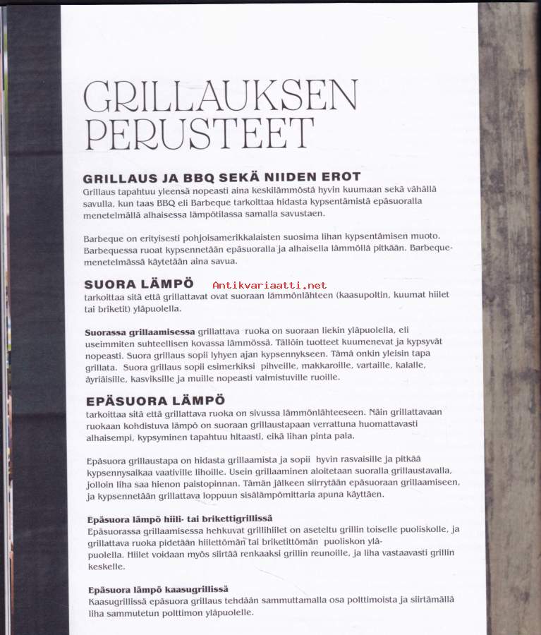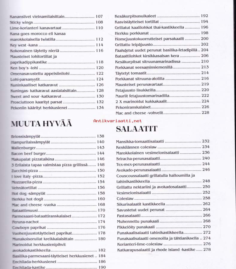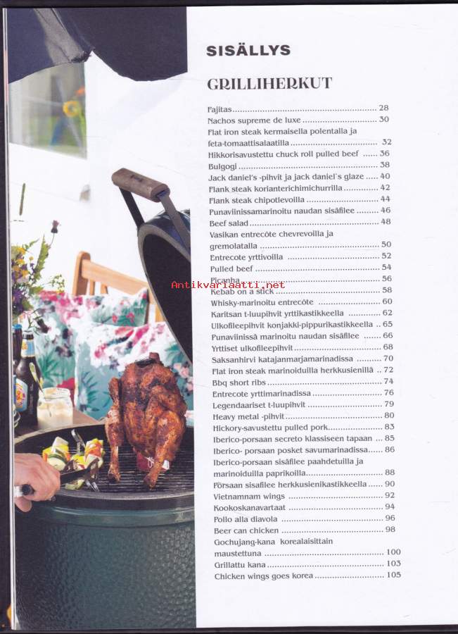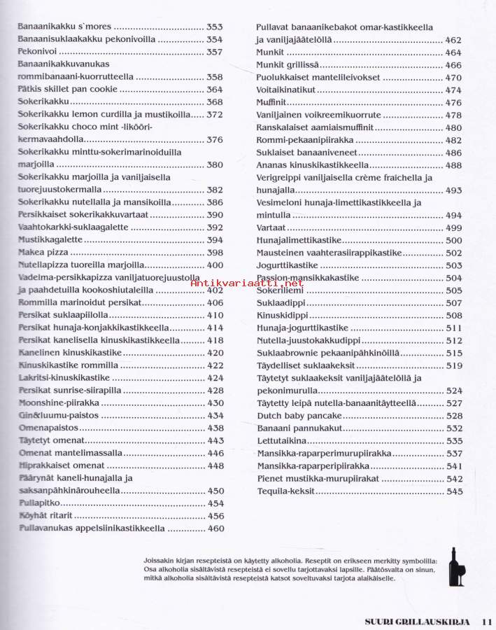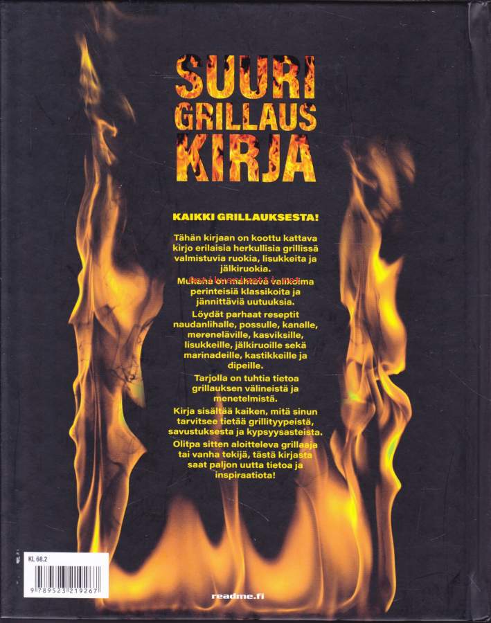 **550 sivua täyttä asiaa - lihat - kalat -kasvikset - lisukkeet - kastikkeet - salaatit - jälkiruoat - leivonnaiset** Paras grillireseptikokoelma! **Suureen grillauskirjaan on koottu niin grilliklassikoita kuin uusia ja upeita makuja maailmalta.** Hehkuvan herkulliset liha-, kala- ja kanaruoat valmistuvat grillissä sulassa sovussa rehevien kasvisruokien ja suussa sulavien jälkiruokien kanssa. Lisäksi mukana maukkaat grilliherkkujen lisukkeet, aina kastikkeista ja dipeistä muihin ruokaisiin lisukkeisiin saakka. **Kirja tarjoaa helposti seurattavien reseptien lisäksi myös ohjeet kypsennysaikojen seurantaan sekä kypsyysasteisiin.** Opit myös eri grillityyppien, grillauksen ja Bbq eroavuudet sekä eri grillausmenetelmät.**** Läpi käydään myös eri tarvikkeet, joita voit tarvita grillauksessa, aina savustustarvikkeista lähtien. Kirjan reseptein ja ohjein grillaat ja savustat makusi mukaan, milloin vain.