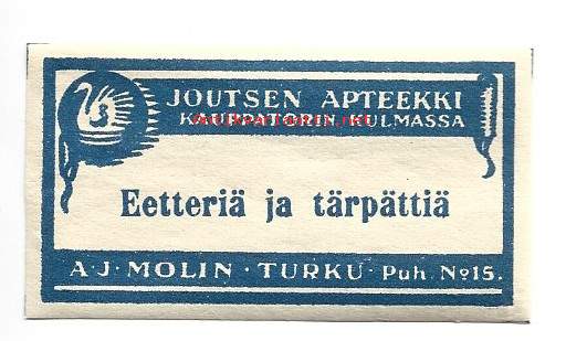 Eetteriä ja tärpättiä - Joutsen Apteekki Turku / A J Molin lääke-etiketti, apteekkietiketti, tuote-etiketti, etiketti