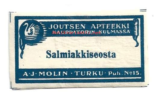 Salmiakkiseosta - Joutsen Apteekki Turku / A J Molin lääke-etiketti, apteekkietiketti, tuote-etiketti, etiketti