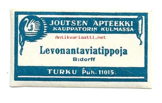 Levonantaviatippoja - Joutsen Apteekki Turku / A J Molin lääke-etiketti, apteekkietiketti, tuote-etiketti, etiketti