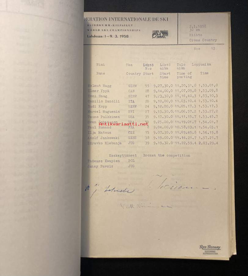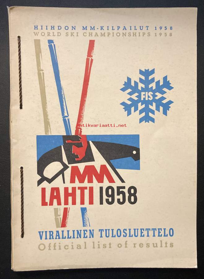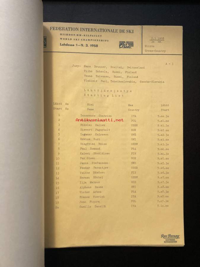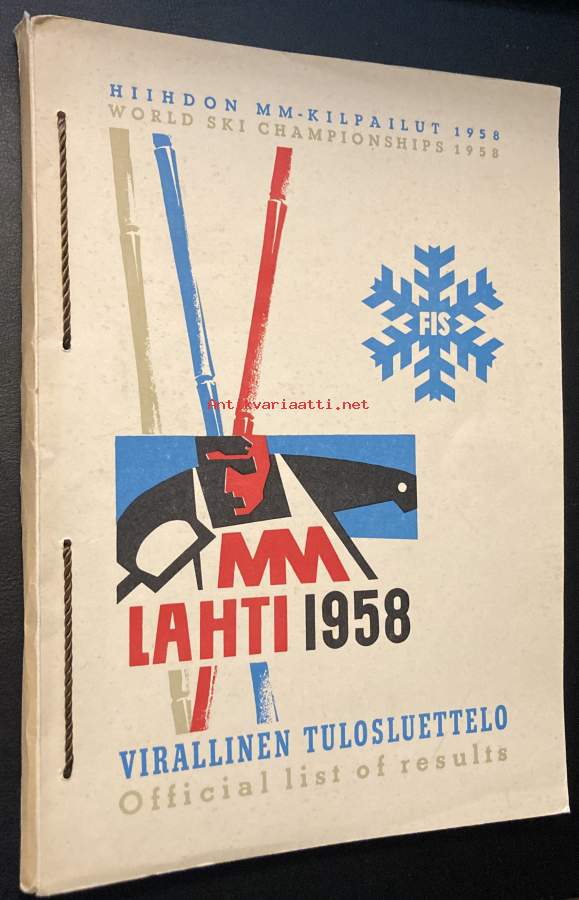 Vuoden 1958 MM-kisojen virallinen tulosluettelo. Paksuhko nippu paperikansissa, joka sisältää jäljennökset tuloslistoista eri matkoilta. Useita kymmeniä sivuja.