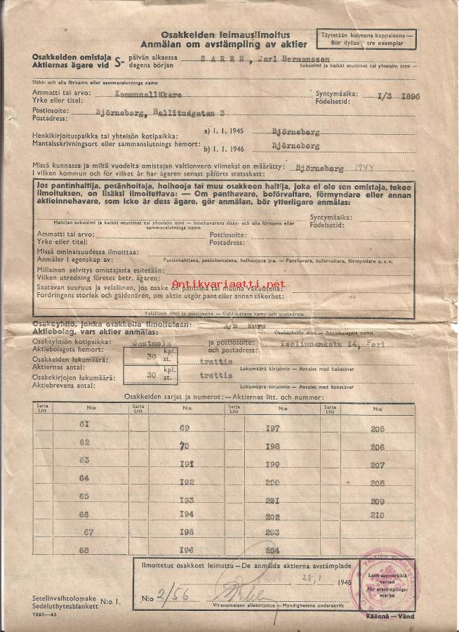 Kurs Ab / Osakkeiden leimausilmoitus 1946 , Helsinki