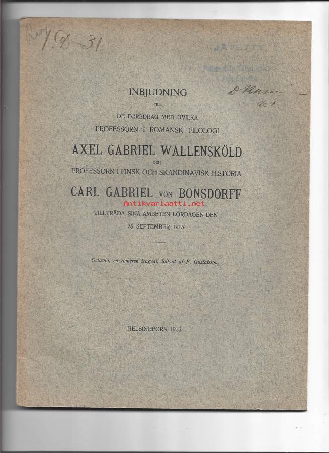 Inbjuting till de föredrag med hvilka professorn i romans filologi Axel Gabriel von Wallensköld tillträda 1915