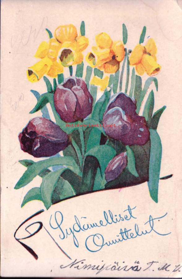 Onnittelukortti/ postikortti - Kukkasia. Sydämelliset onnittelut . Annettu käteen.