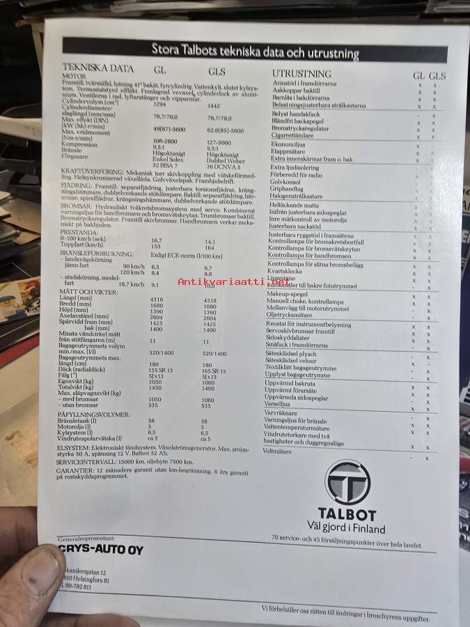Talbot - Iso Kotimainen Talbot GL, GLS 1980 -myyntiesite