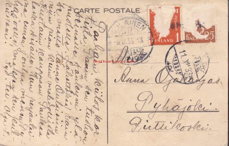 Onnittelukortti/ postikortti - Carte Postale. Leimattu 1933.