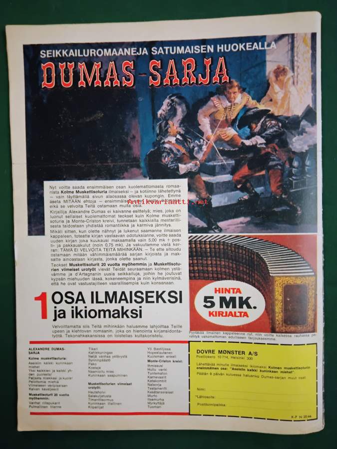 56s., aikakauslehti, sisällys mm. Toivakka taiteilija Pellervo Lukumies tekee talon, tarina Pitkä tyttö, Lis ja Bert Carpelan vauvan Vivi-Mari synnytyskuvia, Pori jääkiekkoilija Raimo Määttänen odottaa Astrid-vaimoa Neuvosto-Virosta kotiin Suomeen, Somero ihmelääkärin Niilo Ollilainen 4%:n ihmelääke, Miehet iskevät silmänsä sääriin - Seija Tyni, Ihmisen pienimmät viholliset: virukset, Maailman kallein valokuvamalli Jean Shrimpton, jamaicalainen Aaron Barclay ja vaimo Pirkko, kreikkalaissuvun verikosto perheen väkivaltaiselle päämiehelle Saksassa, ohjaaja Maunu Kurkvaara: En viitsi enää filmata, runoja - Weijo Ripatti, Suomen viimeinen karhu, Tokio Ginza Mikado maailman suurin yökerho, Maailman parhaat keihäskaksoset Kaisa ja Kirsti Launela, testi Millainen poika sopii sinulle?, sarjakuvat James Bond Kultasormi, Tarzan, Ratsupoliisi King, Kalle Kehveli, Joonas, mainos Lahden III A-olut, jatkosarja Rakkaus polttaa, jäätää, pakina Me huoltajat Arvi E. Arjatsalo