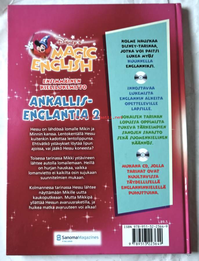 Mukana CD Uuden kielen oppiminen on hauskaa ja sujuu helposti, kun opettajina ovat Disneyn tutut hahmot! Koululaisen kielilukemisto sisältää kolme helppolukuista tarinaa, jotka sopivat englannin alkeita harjoittelevalle. Jokaisen kertomuksen ohessa on kuvitettu sanasto, tarinaan liittyvä tehtävä ja tarinan suomennos. Kuullun ymmärtämistä ja oikeaa ääntämistä voi harjoitella kirjan mukana seuraavan cd:n avulla, jolle tarinat on luettu.