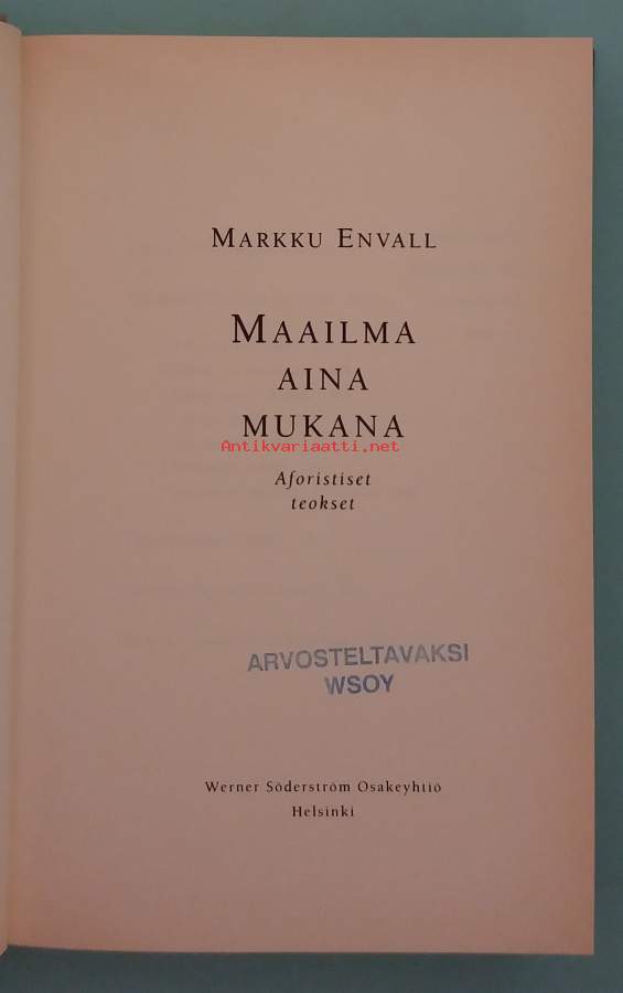 Teos kokoaa Envallin aforistisen tuotannon yksiin kansiin ja tarjoaa laajan katsauksen hänen filosofiseen, runolliseen ja yhteiskunnalliseen ajatteluunsa. Dimensiot 23 ¤ 15 cm. Leima: Arvosteltavaksi WSOY