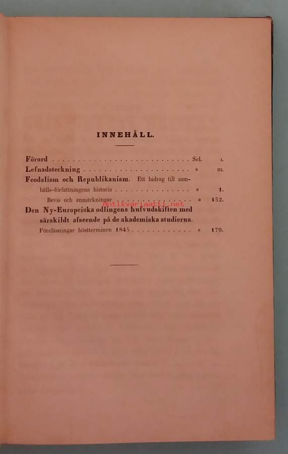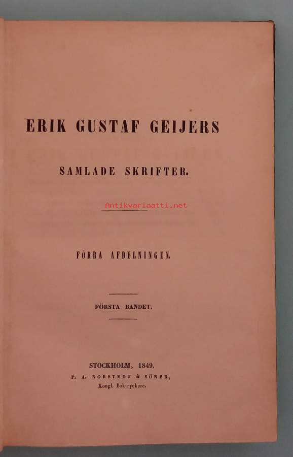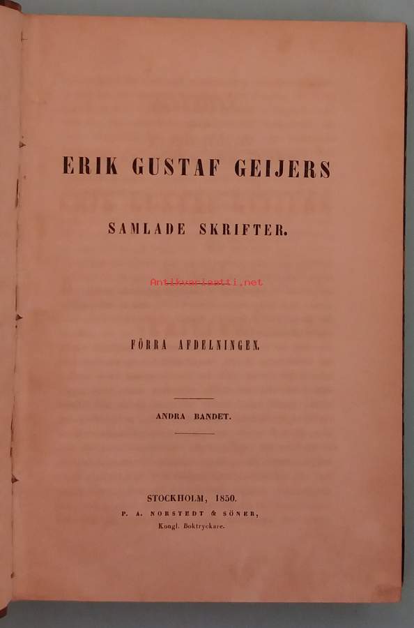 Alkuperäisidos, kummassakin mukana sisällysluettelo. Sisältö: Filosofisia ja historiallisia esseitä, kuten "Feodalism och Republikansim" ja luentoja eurooppalaisesta sivistyksestä. Osassa 1 mukana teräspiirroksena tehty muotokuva Erik Gustaf Geijeristä. Originalband, båda med innehållsförteckning. Innehåll: Filosofiska och historiska essäer, såsom ”Feodalism och Republikansim”, samt föreläsningar om den europeiska bildningens utveckling. I del 1 ingår även ett stålsticksgravyrporträtt av Erik Gustaf Geijer.