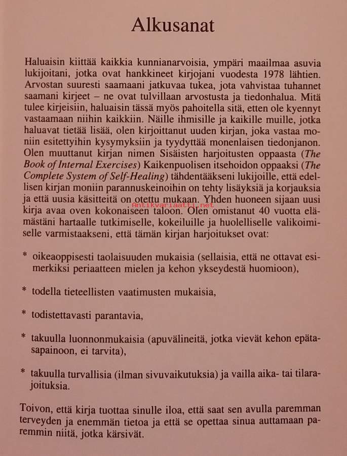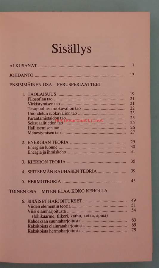 Sisältö kattaa mm. taolaisen filosofian, energiateoriat ja sisäiset harjoitukset kuten eläinliikkeet ja hermoharjoitukset. Dimensiot 22 ¤ 14 cm. Kuvitettu.