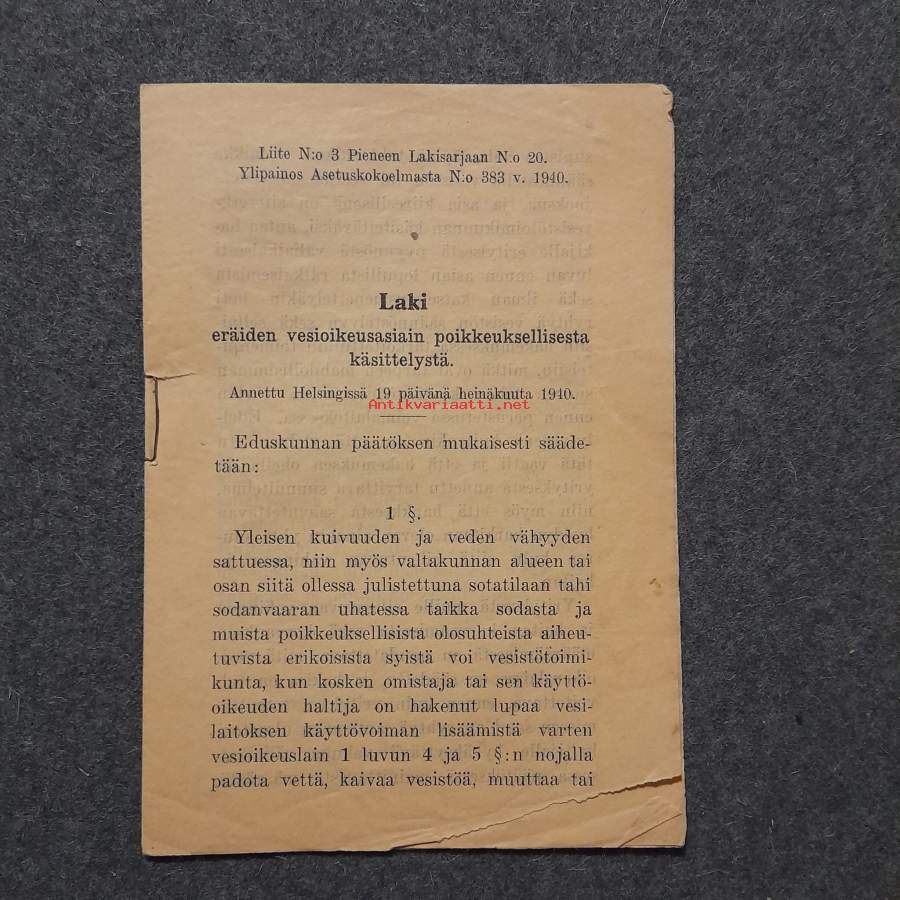 Pieni lakisarja no.20 Laki eräiden vesioikeusasiain poikkeuksellisesta käsittelystä