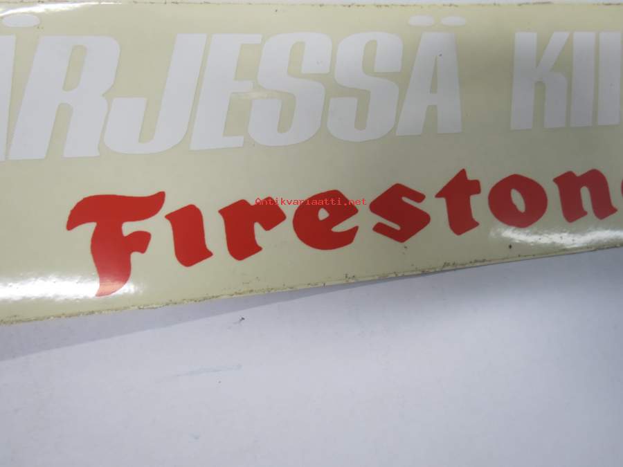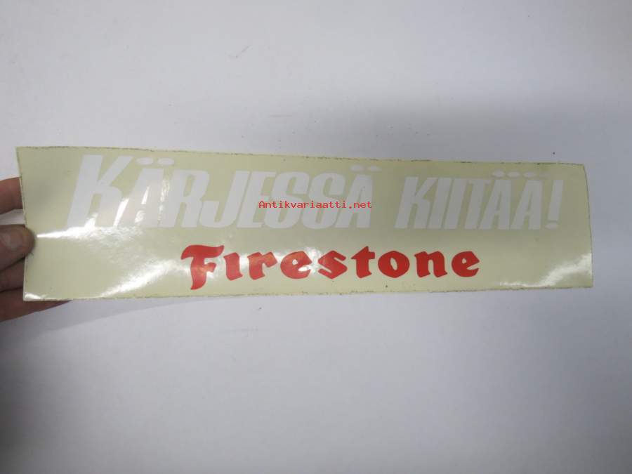 Kärjessä kiitää! Firestone -tarra, alkuperäinen 1970/80 -lukujen mainostarra