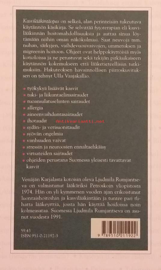 Opaskirja tarjoaa hoito-ohjeita yleisiin vaivoihin suomalaisista kasveista mm: kivut, ummetus, migreeni, vaihdevuosivaivat, ruoansulatuselinten sairaudet, allergiat, sydän- ja verisuonitaudit, syöpään liittyvät ongelmat, vanhuuden vaivat ja paljon muuta Dimensiot 21 ¤ 15 cm. Kuvitettu.