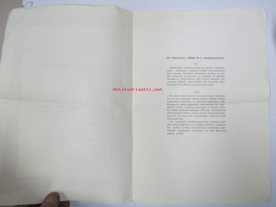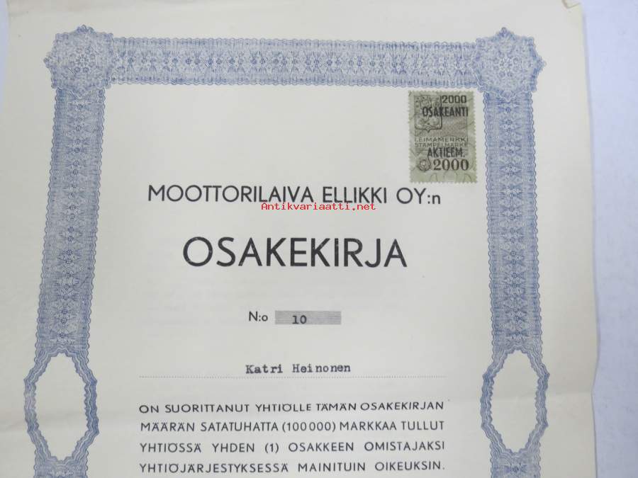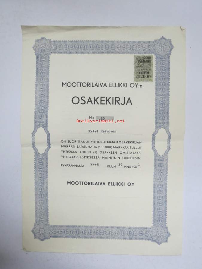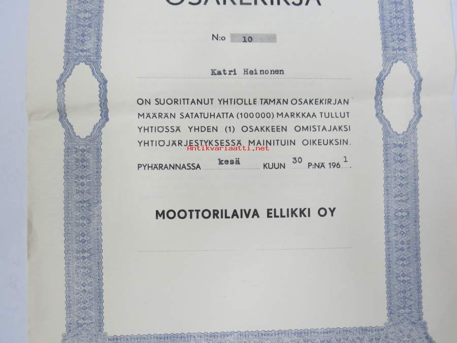 Moottorilaiva Ellikki Oy osakekirja nr 10 Katri Heinonen, 1 osake 100 000 mk, Pyhäranta 30.6.1961
