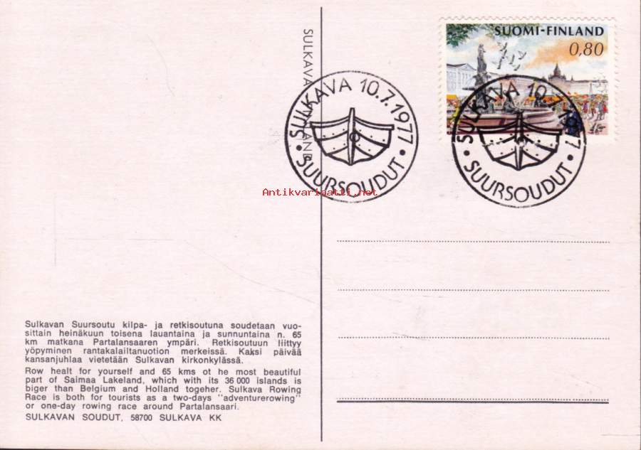 Filatelia Suomi - Sulkavan soudut / suursoudut 10.7.1977. Erikoisleimakortti.