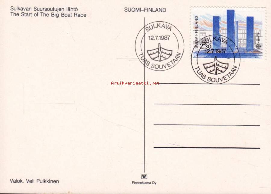 Filatelia Suomi - Sulkavan soudut 12.7.1987. Erikoisleimakortti.