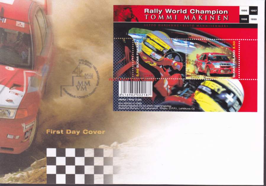 Suomi FDC (ensipäiväkuori) Tommi Mäkinen BL24 (3.3.2000). LAPE 1513-14. Rally World Champion