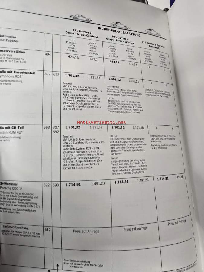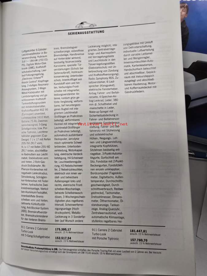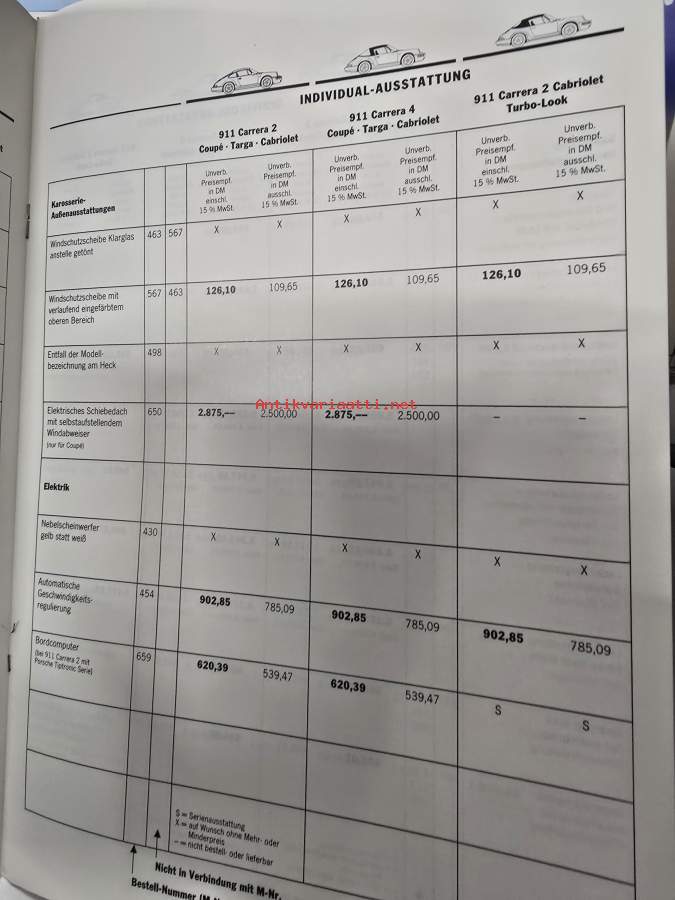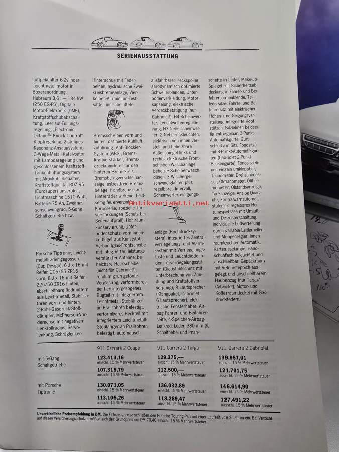 Porsche 911 vm. 1999 -myyntiesite (koko 15,5 x 21 cm, kovat kannet, 113-sivuinen kirja, painettu syyskuussa 1998), saksankielinen