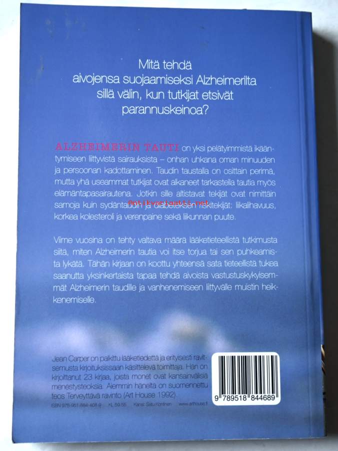 Mitä jokainen voi tehdä aivojensa suojaamiseksi Alzheimerilta sillä välin, kun tutkijat etsivät parannuskeinoa? Vaikka lopullista parannuskeinoa Alzheimerin tautiin ei vielä ole löydetty, tutkijat ovat vakuuttuneita siitä, että se kuitenkin löytyy jonain päivänä. Kun vaakakupissa on oman minuuden ja persoonan kadottaminen, ymmärtää, miksi Alzheimerin taudin torjumista ja varhaista puuttumista tutkitaan tänä päivänä niin kiihkeästi. Vaikka Alzheimerin taudin taustalta on löytynyt sille altistavia perimään liittyviä syitä, monet tutkijat pitävät tätä tautia ja muita dementian muotoja myös elämäntapasairauksina. Tutkijat ovat yhä uudelleen törmänneet siihen tosiasiaan, että jotkut Alzheimerin taudille altistavat seikat ovat samoja kuin sydänsairaudelle ja diabetekselle altistavat seikat, kuten liikalihavuus, huonot kolesteroliarvot, korkea verenpaine ja fyysinen passiivisuus. Viime vuosina on syntynyt valtava määrä lääketieteellistä tutkimusta siitä, mitä voisimme mahdollisesti tehdä Alzheimerin taudin puhkeamisen estämiseksi ja lykkäämiseksi. Tähän kirjaan Jean Carper - joka itsekin kantaa perimässään Alzheimerin taudille altistavaa geeniä - on kerännyt yhteensä 100 tieteellistä tukea saanutta yksinkertaista tapaa suojata aivoja niin, että ne ovat vastustuskykyisempiä Alzheimerin taudille ja vanhenemiseen liittyvälle muistin heikkenemiselle. Näistä yksinkertaisista keinoista lukija voi valita ne, joiden noudattaminen hänelle sopii parhaiten.