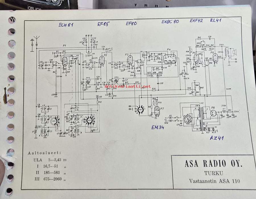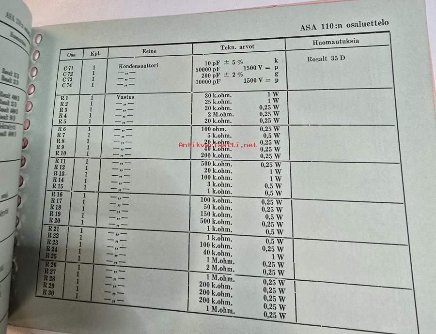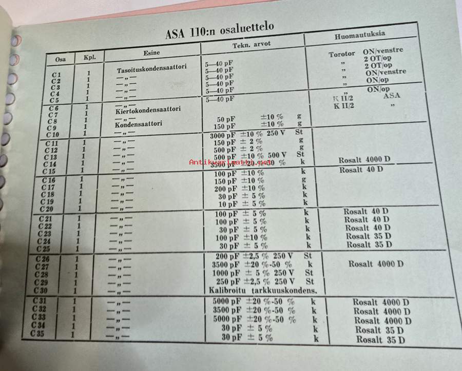 Asa 110 radio vastaanotin osaluettelo.
