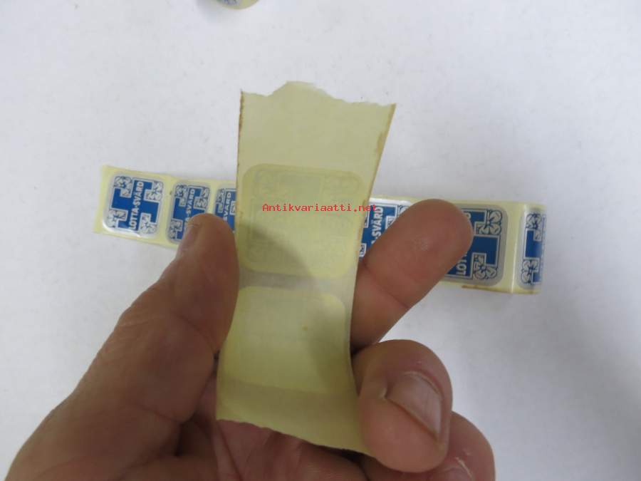Tarramerkki on 3 x 3 cm, liimauksen pitävyys voi olla heikentynyt tai on olematon, myydään kymmen kappaleen erissä hintaan 2,00 €.