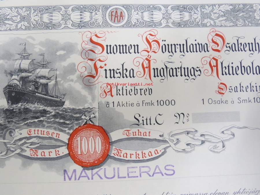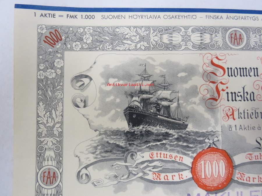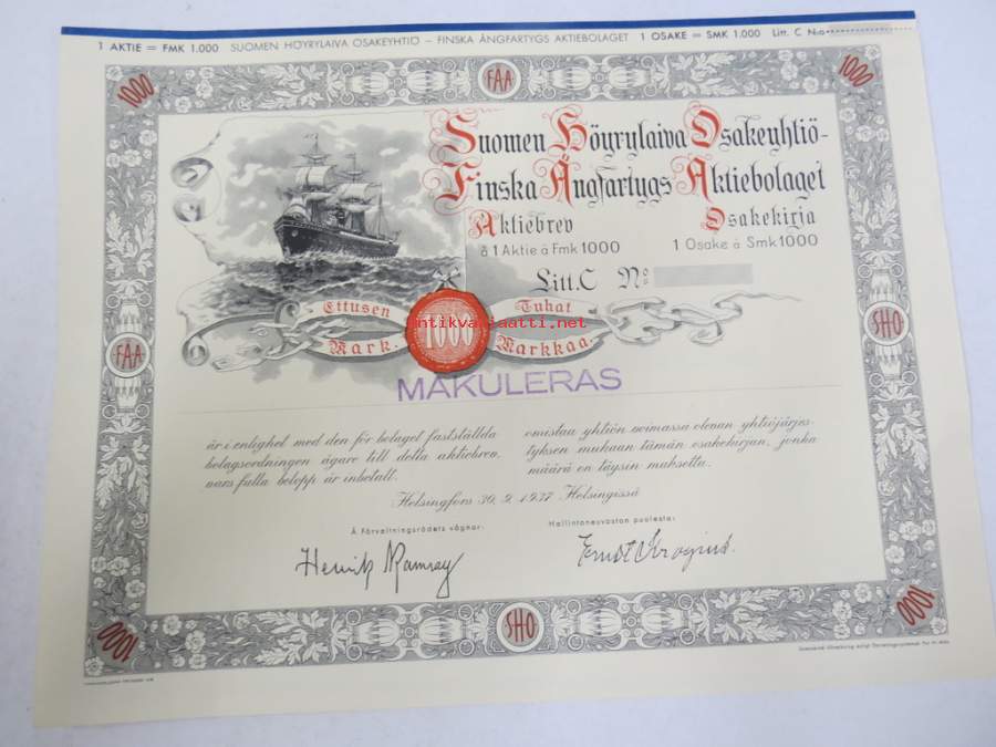 Suomen Höyrylaiva Osakeyhtiö - Finska Ångfartygs Aktiebolag, Helsinki 1937, 1 osaketta / 1 aktie á 1 000 mk, Litt. C -osakekirja / share certificate