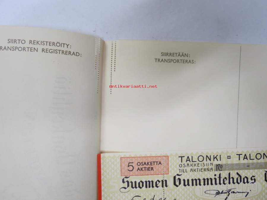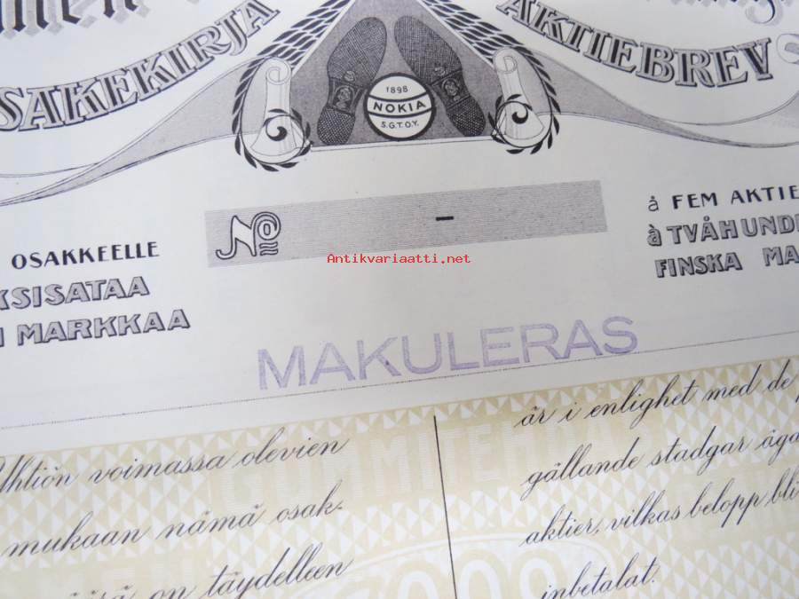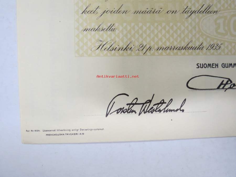 Suomen Gummitehdas Osakeyhtiö (Nokia) osakekirja - aktiebrev 5 osaketta á 200 Smk - å 5 aktier á 200 Fmk, 5 000 mk, Helsinki 1935, blanco, makuleras -merkitty