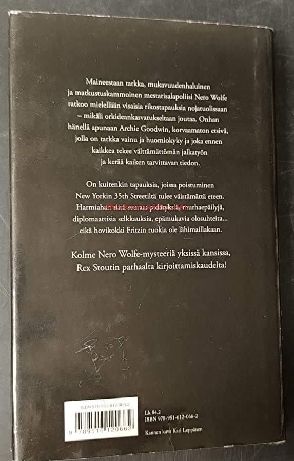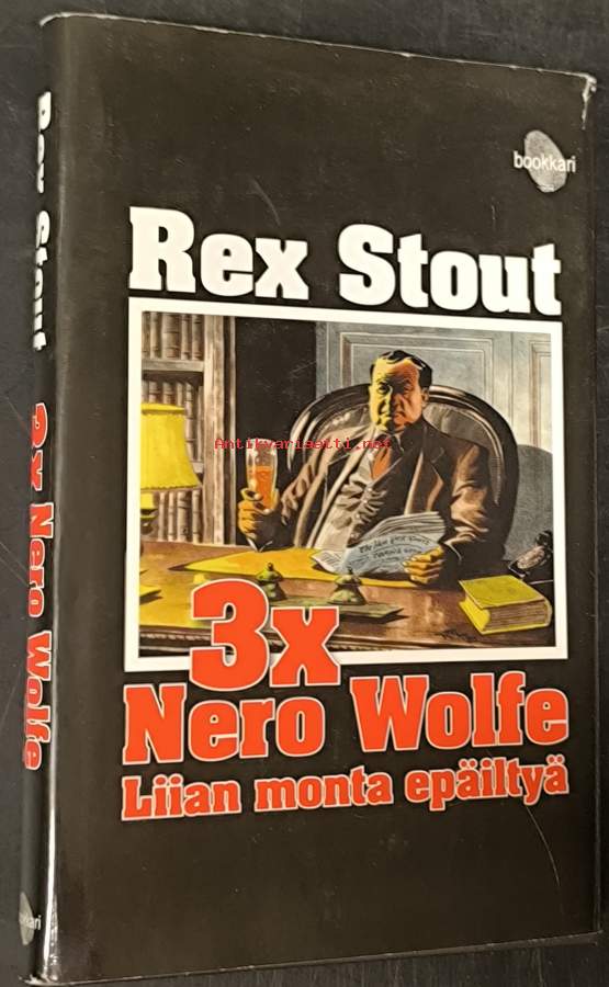"Kolme Nero Wolfe-mysteeriä yksissä kansissa Rex Stoutin parhaalta kirjoittamiskaudelta!" : Suom: Reijo Kalvas : Alkuteos "Three for the Chair" vuodelta 1975