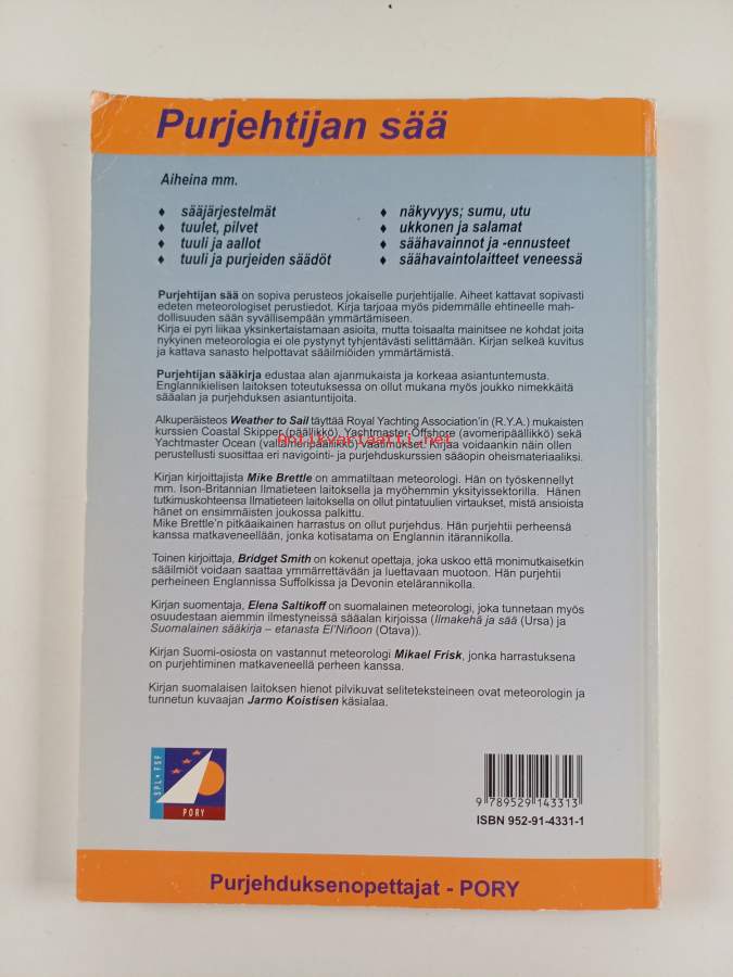 Muu(t) tekijä(t): Elena Saltikoff, Mikael FriskMerkinnät: omistajamerkintäAlkuteos: Weather to sailAsiasanat: purjeveneet, purjehdus, sääilmiöt, sää, veneet, säänennustus, säähavaintovälineet, tuuli