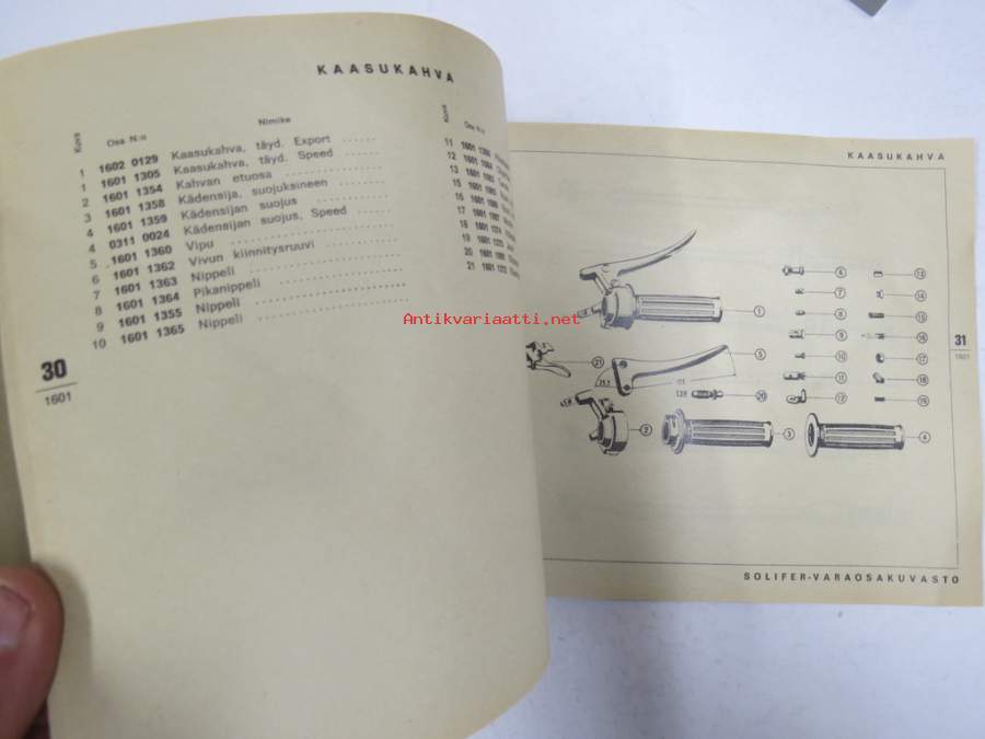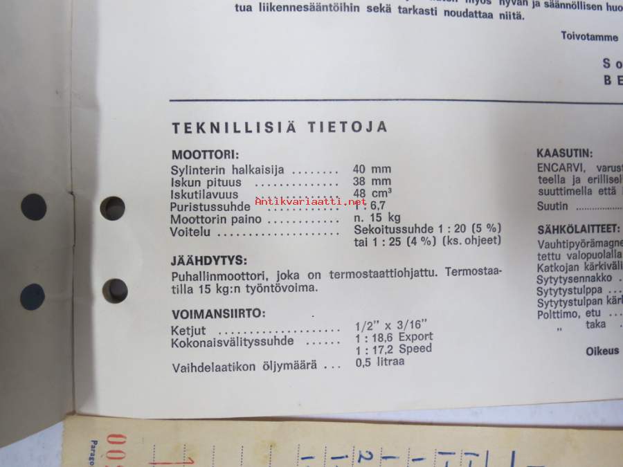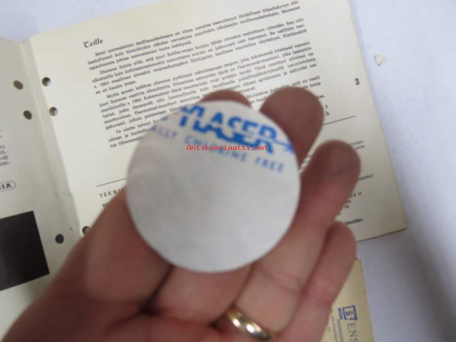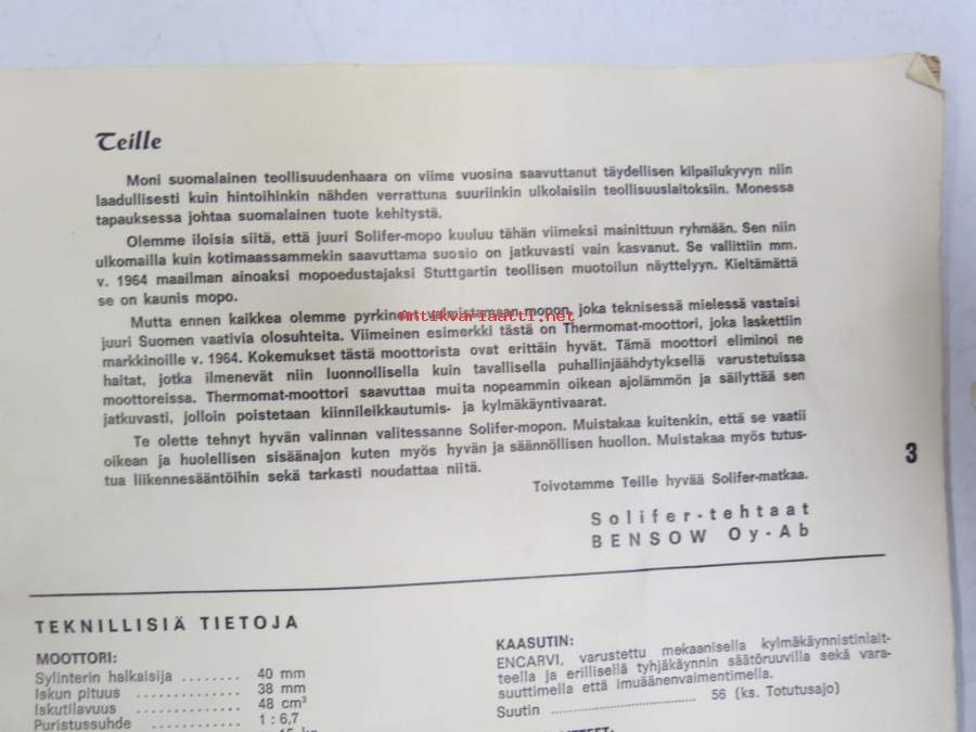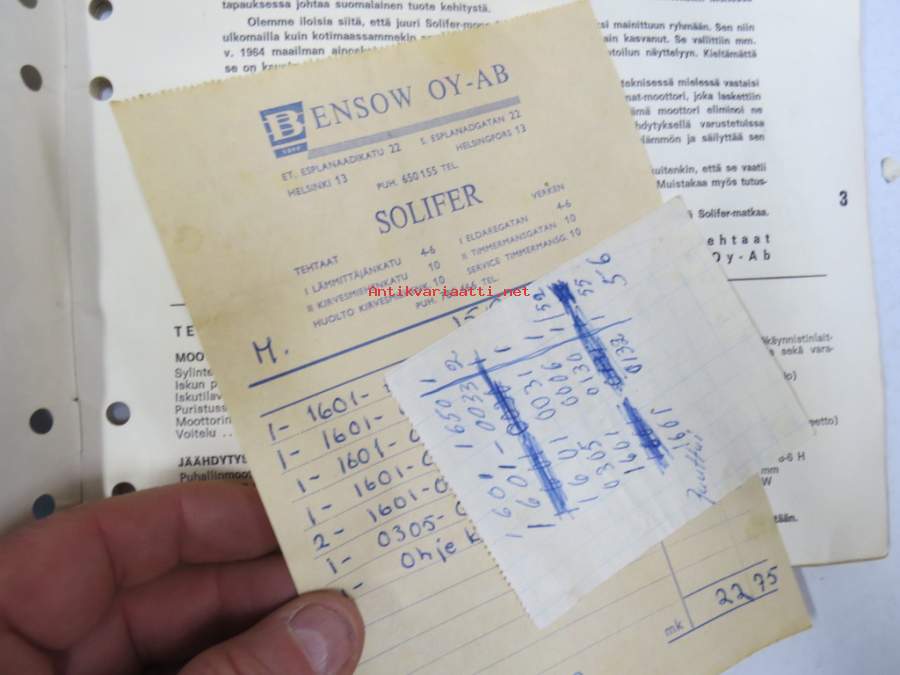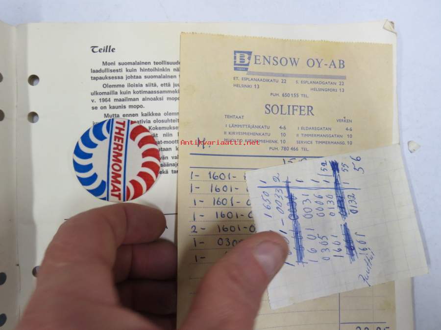 Solifer Export / Speed Thermomat käsikirja - käyttöohjekirja - varaosaluettelo, mukana Bensow-kuitti, johon merkitty osia ja tämä ohjekirja sekä Thermomat -irtotarra