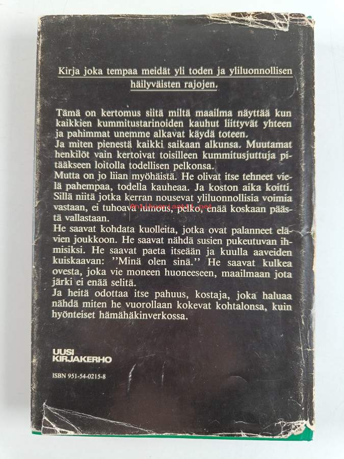 Hyvä. Pienoista kolhua, pienoista kulumaa, selkämyksessä hieman vinoutta. Kansipaperin kunto: joitain repeämiä/kulumaa & tahraisuutta