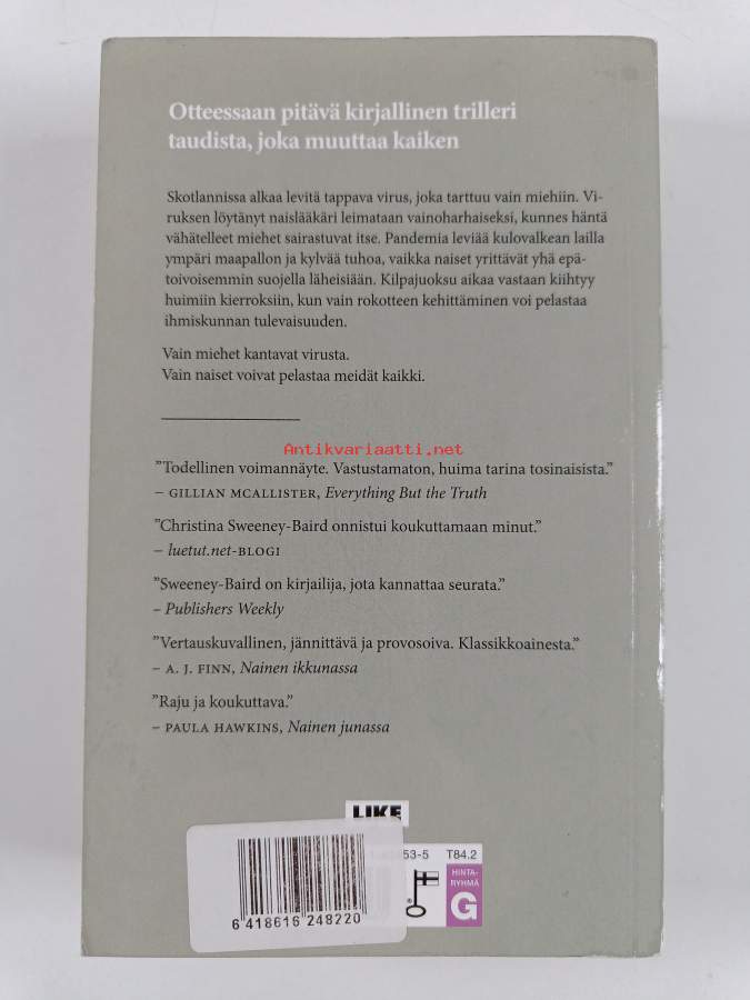 Muu(t) tekijä(t): Kirsi LuomaAlkuteos: The end of menAsiasanat: naisen asema, sukupuuttoon kuoleminen, lääkärit, miehet, uhrit, sairastuminen, virustaudit, pandemiat, antropologit, uhat